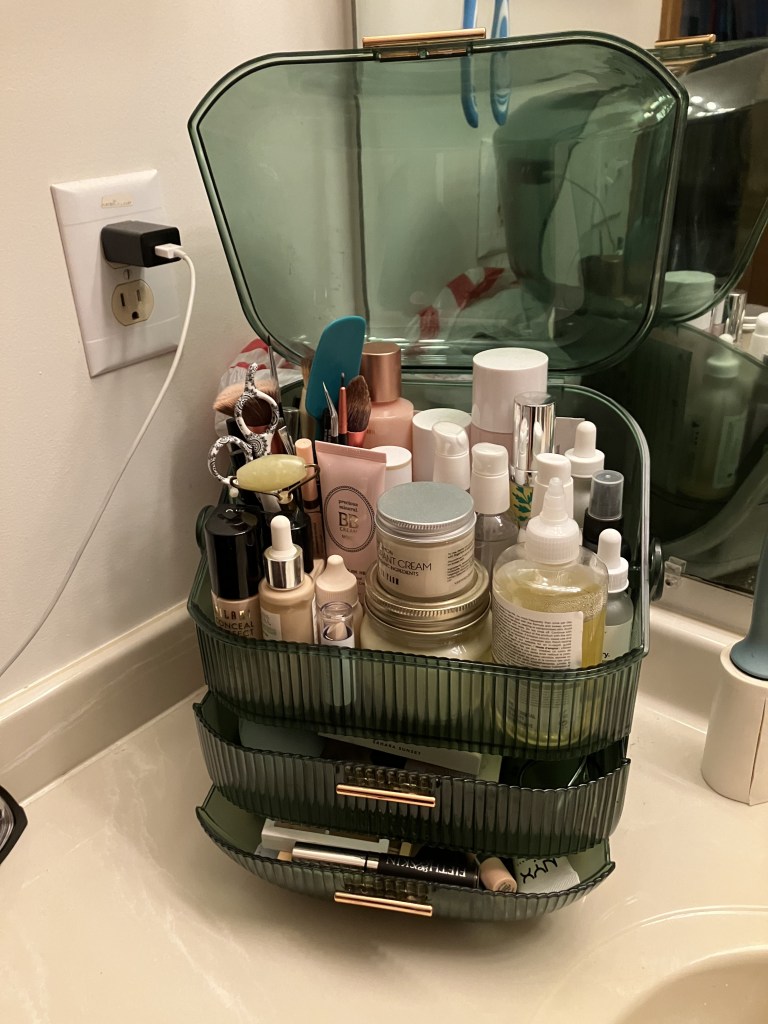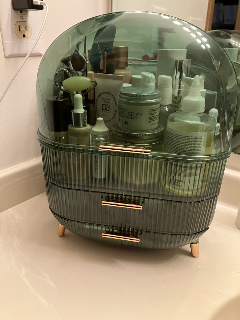 Makeup caddy that is tall enough it can hold ALL the bottles. (Well… all of mine anyway.) It’s so pretty!