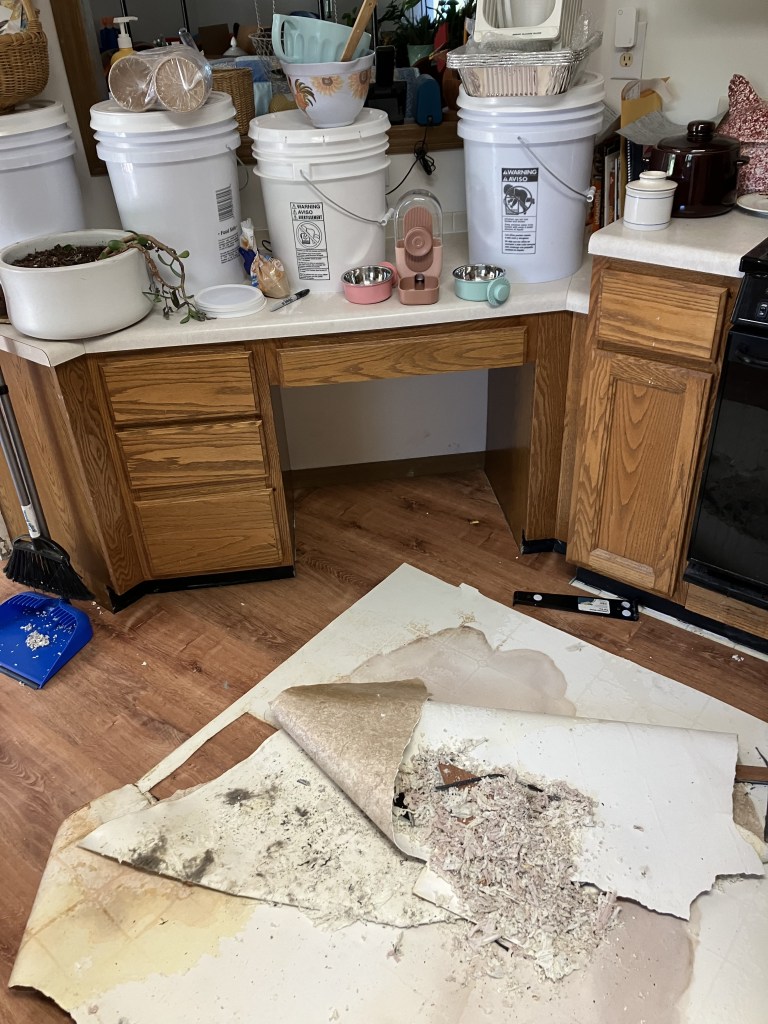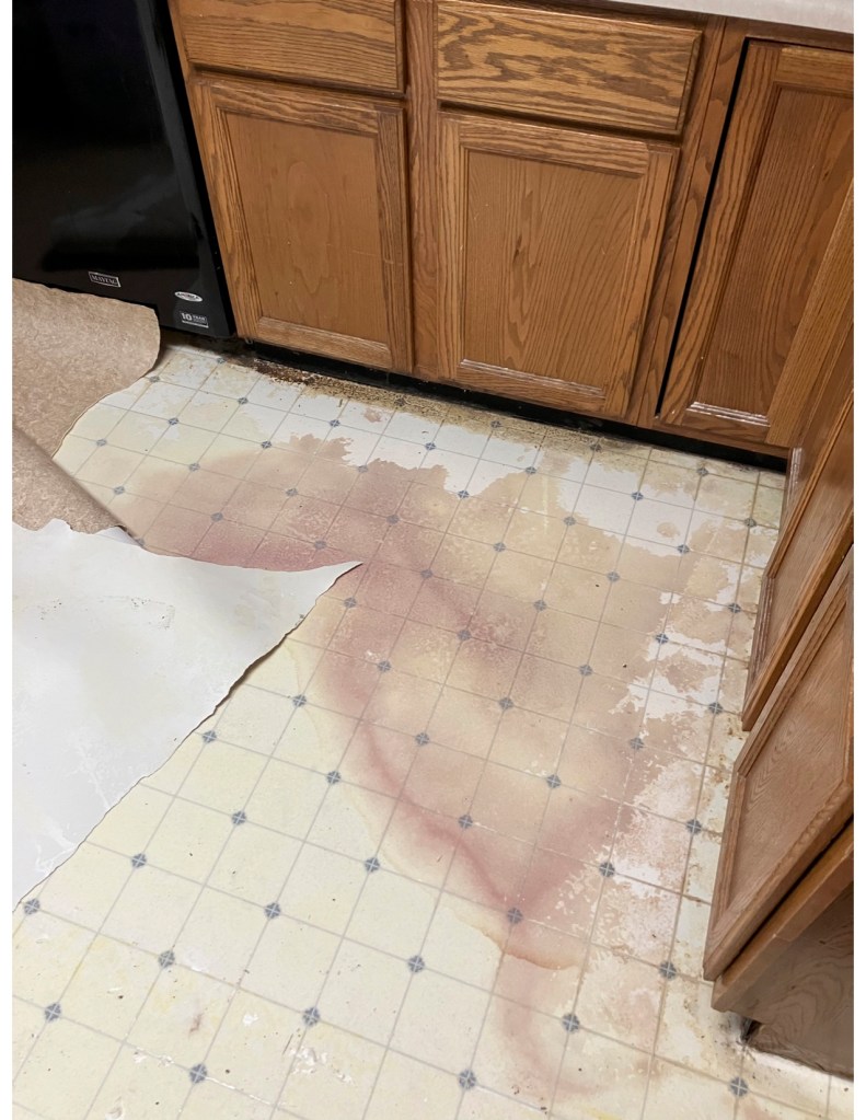 A few years ago our dishwasher leaked. It got under the floor and left big, discolored rings. I was worried that it would be moldy underneath and was nervous to even pull the linoleum up. My Grandparents put down this beige-tan linoleum on top of their cute white and blue flooring that the house had to begin with. I do not understand this choice. ANYWAY…